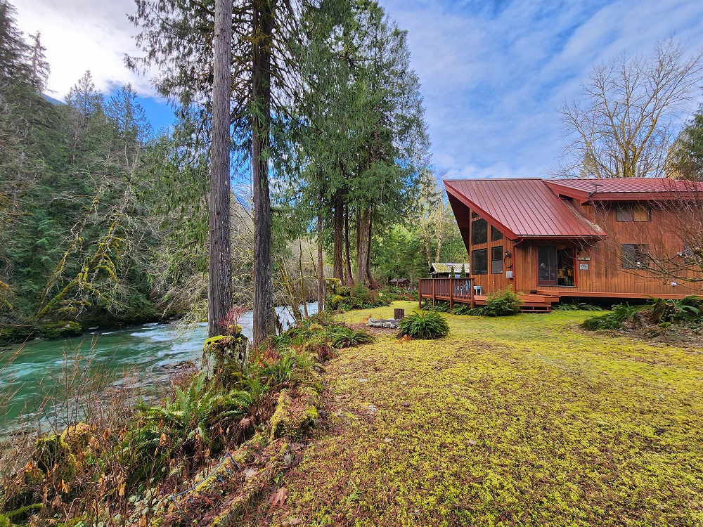 Tucked into a private nook of mature trees, enjoy a view of the Cascades River while you relax after exploring the incomparable North Cascades. Whether out on the deck experiencing the wild and scenic Cascade River with a morning coffee or under the stars from the 3 person wood fired hot tub, this is a river cabin like no other. Enjoy plenty of room for the family to stay comfortably with high speed internet, streaming entertainment and board games while maintaining the off-grid cabin feeling.